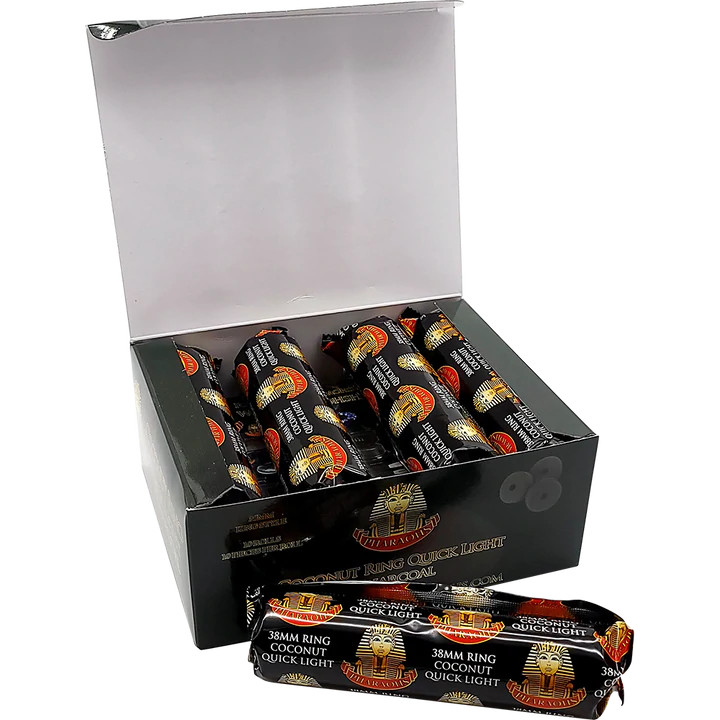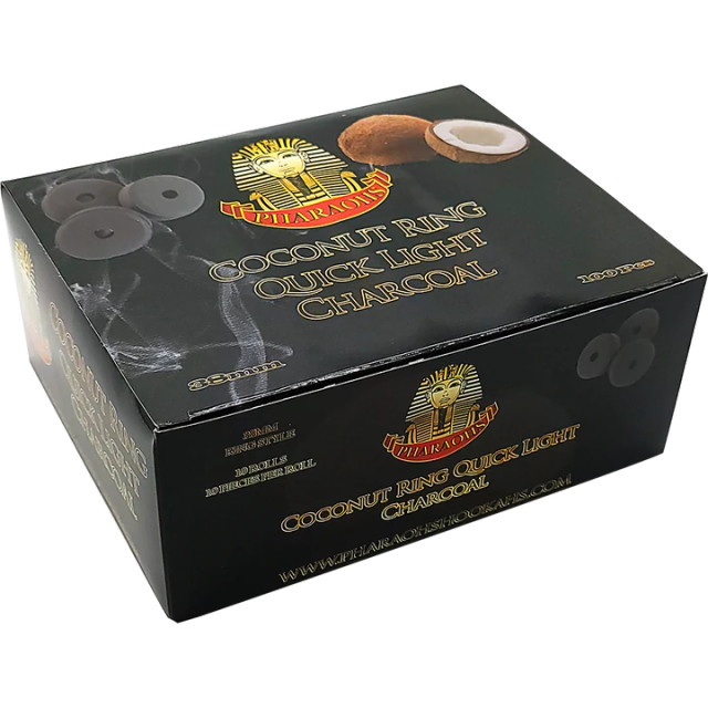Charcoal Type Quick Light Charcoal Material Coconut Cut Round Size Per Piece 38mm Diameter Quantity Per Box 100 Pieces (10 rolls of 10 pieces) Weight Per Box N/A Charcoal Packaging Pharaohs Carton Box